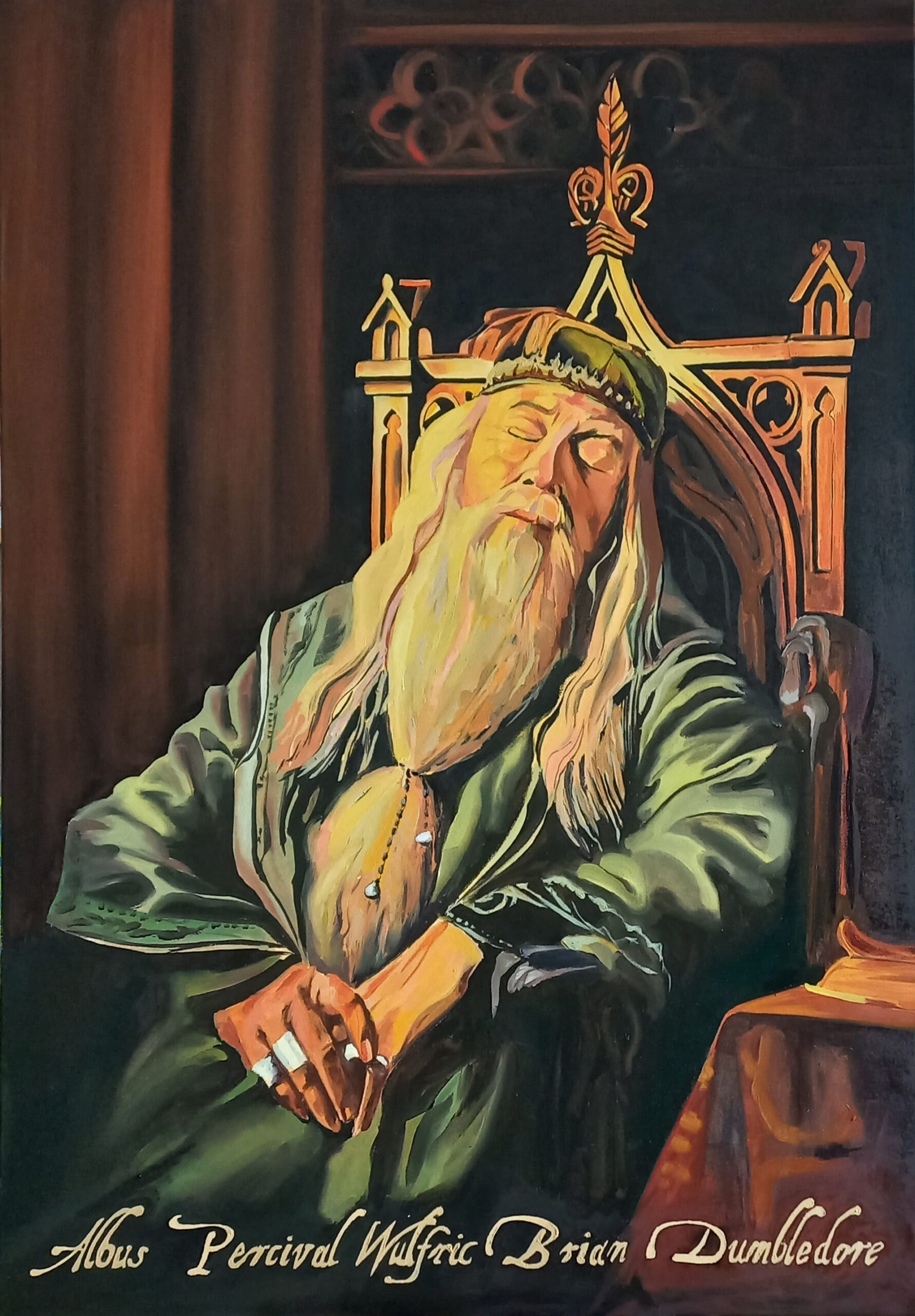 Obraz wykonany w technice olejnej przedstawia Albus Dumbledore, pogrążonego we śnie na portrecie wiszącym w gabinecie dyrektora Hogwartu. Postać ukazana jest w charakterystycznych, długich szatach, z zamkniętymi oczami i spokojnym, dostojnym wyrazem twarzy. Miękkie pociągnięcia pędzla oraz ciepła, stonowana kolorystyka budują atmosferę ciszy i zadumy, typową dla malarstwa olejnego. Delikatne światłocienie podkreślają magiczny, nieco melancholijny nastrój sceny, nawiązującej do filmu Harry Potter i Książę Półkrwi.