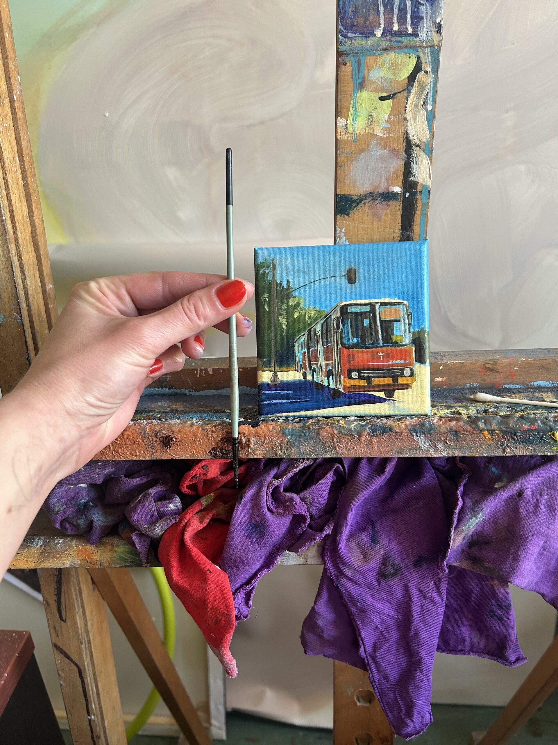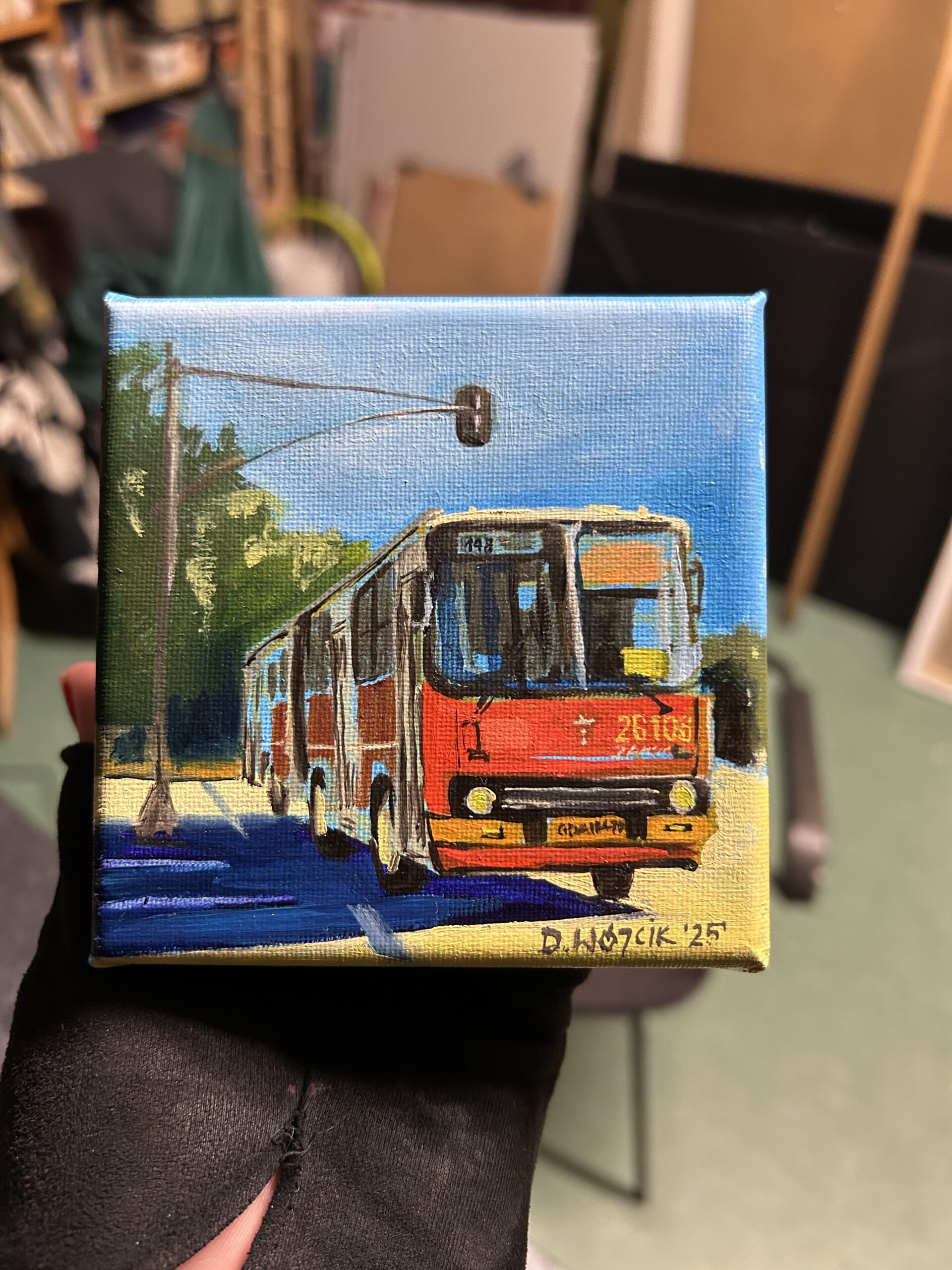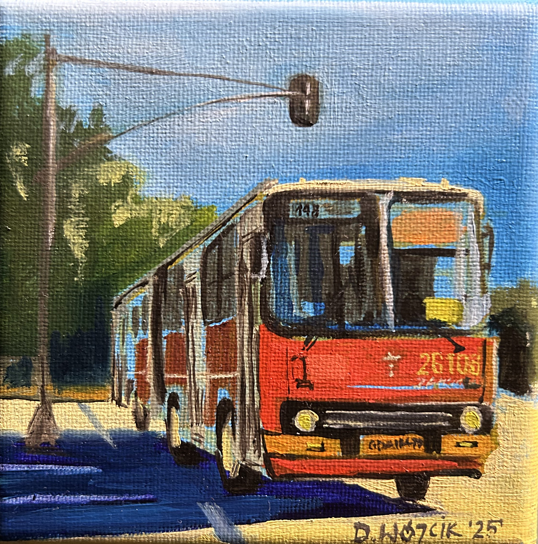 Na pierwszym planie widzimy autobus Ikarus 280 linii 148, uchwycony w sposób, który sam w sobie emanuje nostalgią. Autobus zajmuje całą uwagę obrazu — jego charakterystyczna, kanciasta sylwetka i duże okna przywołują wspomnienia minionej epoki komunikacji miejskiej. Nie ma ludzi ani elementów miejskich w tle, dzięki czemu cała scena koncentruje się wyłącznie na pojeździe. Kolory są kontrastowe i wyraziste, podkreślając formę i detal autobusu. Pomimo nowoczesnego wykonania obrazu, przedstawienie samego autobusu tworzy subtelne, nostalgiczne odczucie, jakby czas na moment zatrzymał się wokół tej ikonicznej maszyny.