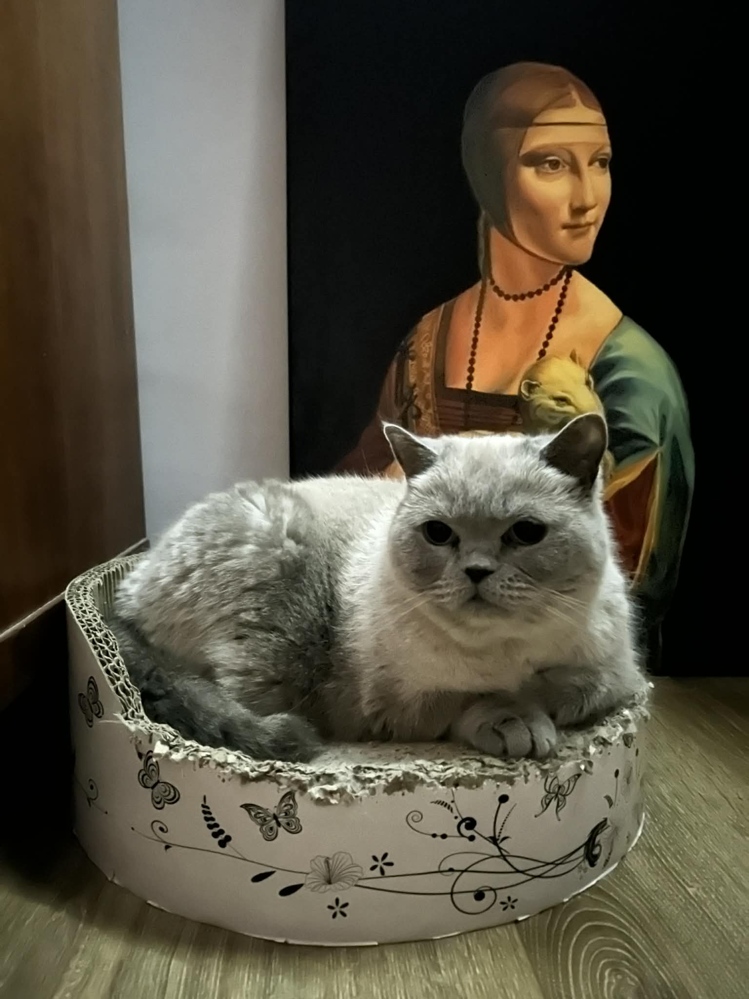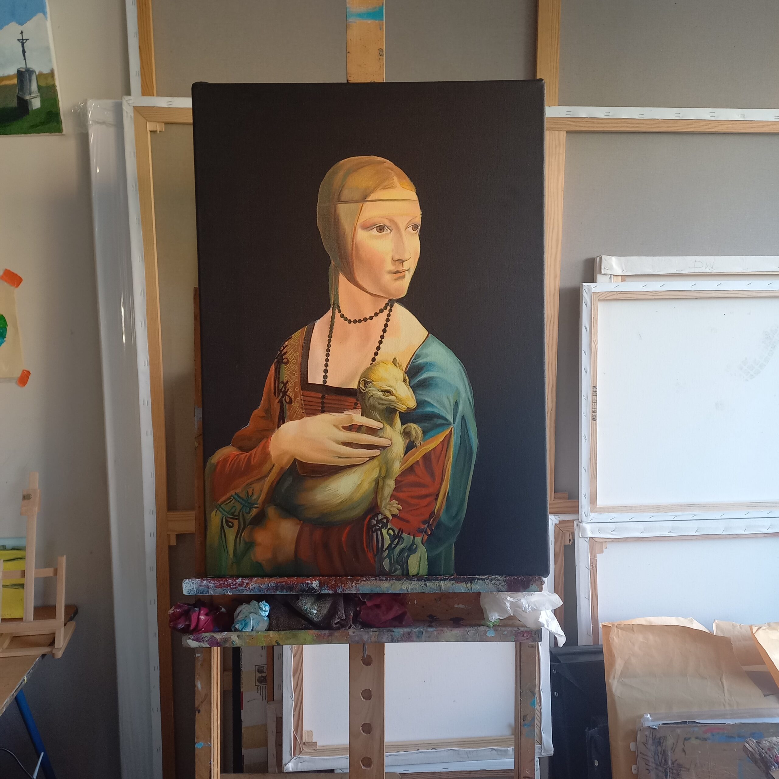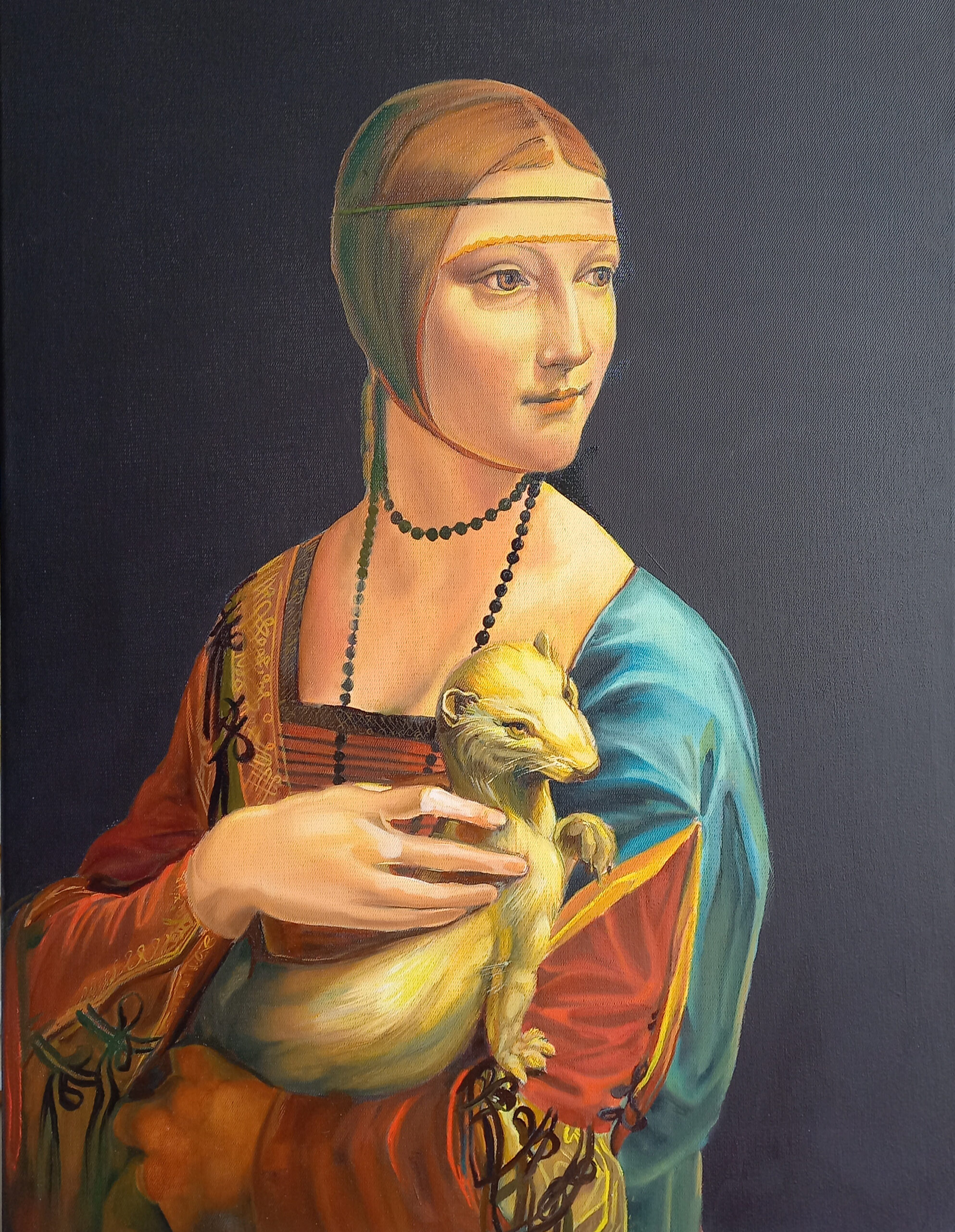 Olejna kopia słynnego renesansowego portretu autorstwa Leonardo da Vinci. Obraz przedstawia młodą kobietę ujętą w półpostaci, zwróconą lekko w bok, z delikatnym, skupionym wyrazem twarzy. W ramionach trzyma białego gronostaja – symbol czystości, szlachetności i wysokiego statusu. Subtelne światłocienie, stonowana kolorystyka oraz realistyczne oddanie detali nadają kompozycji elegancji i harmonii. Kopia wykonana techniką olejną nawiązuje do oryginalnego stylu renesansu, oddając spokojny, ponadczasowy charakter dzieła.