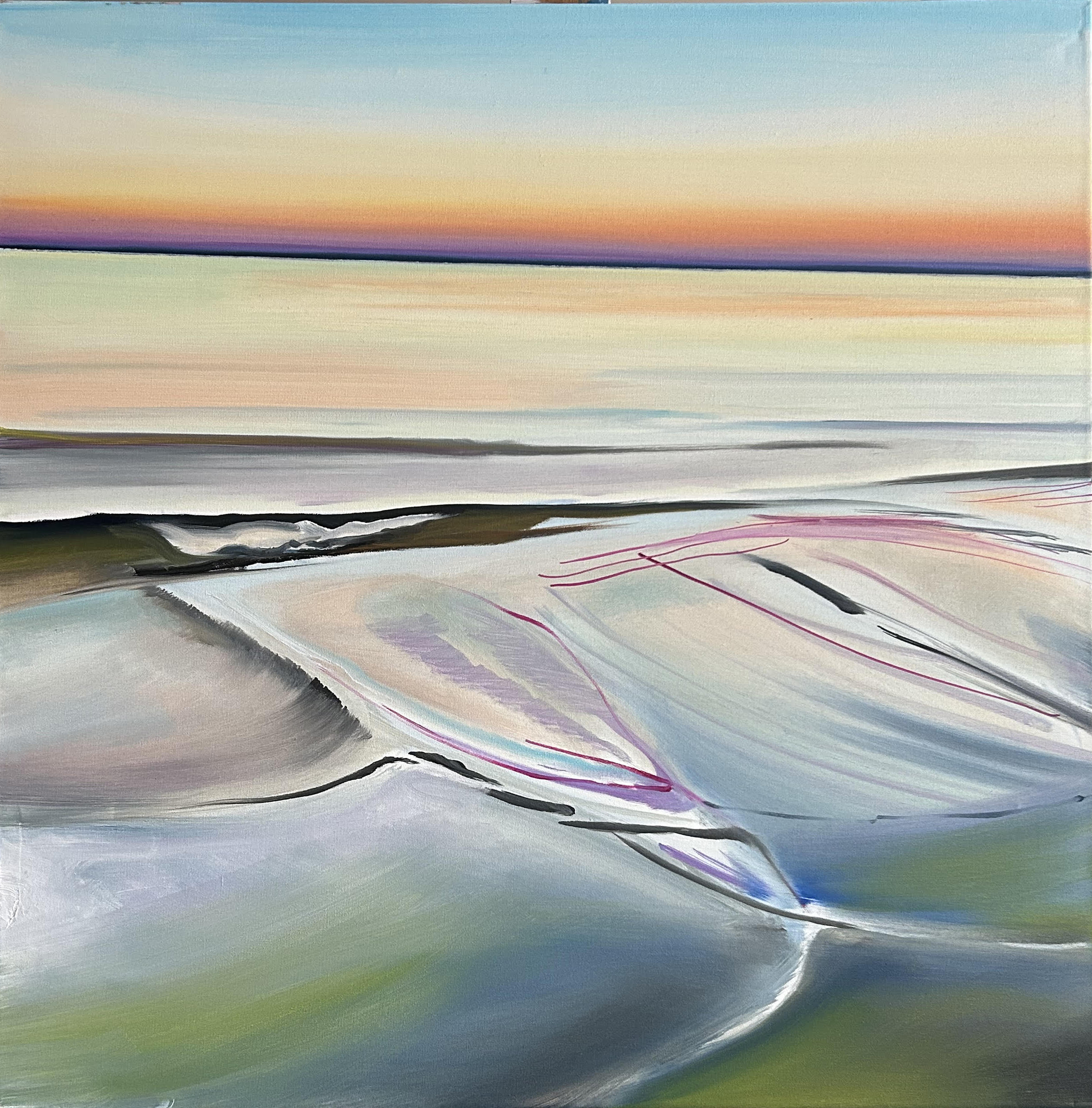 Obraz przedstawia widok na Zatokę Gdańską z Brzeźna w bardzo oszczędnej, niemal medytacyjnej kompozycji. Horyzont umieszczony jest wysoko, blisko górnej krawędzi płótna i delikatnie opada w jedną stronę – nie jest idealnie prosty, co wprowadza subtelne napięcie i wrażenie naturalności. Niebo zajmuje tylko wąski pas u góry, podczas gdy niemal całą powierzchnię obrazu wypełnia spokojne, rozległe morze.