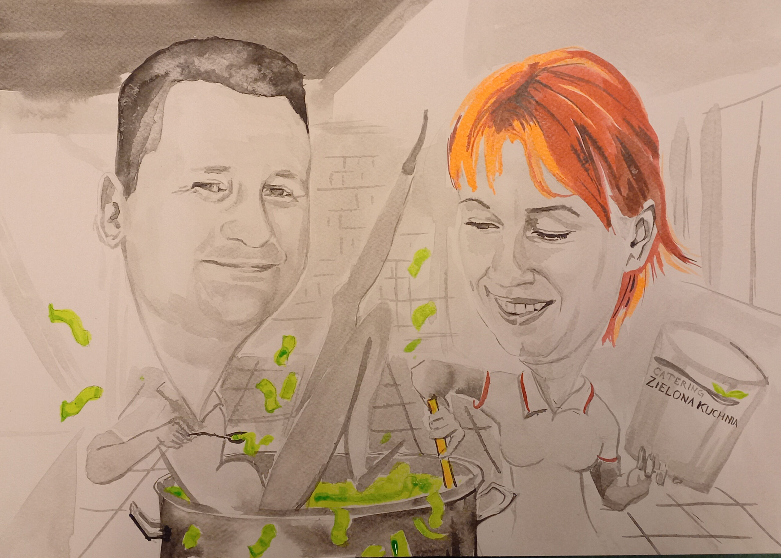 Rysunek wykonany w technice tuszu na papierze czerpanym przedstawia parę w humorystyczny, lekko przerysowany i w pełni personalizowany sposób. Ilustracja łączy elegancję tradycyjnej techniki z zabawnym charakterem sceny, dzięki czemu staje się wyjątkową i bardzo osobistą pamiątką.